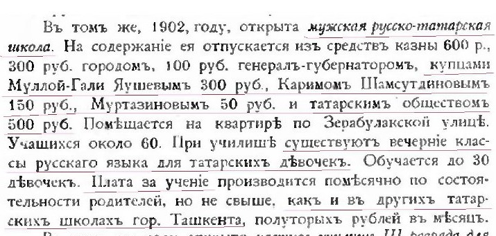 .. Что касается татарского мактаба, то в 1902 г. он был преобразован в русско-татарское училище (школу). Был образован попечительский совет, в разные годы в него входили авторитетные представители ташкентского татарского общества: Ш. Ишаев, Батыршин, Чанышев, X. Бурнашев, А. Диваев, Б. Илькин, М. Тюменев, братья Яушевы, А. Суташев, С. Еникеев, X. Ширинский, Я. Сейфульмулюков, М. Ахтямов, М. Уразаев, X. Рахматуллин, Сафагареев, Ш. Гумеров, Ш. Биккулов, М. Бакиров и др. .. |