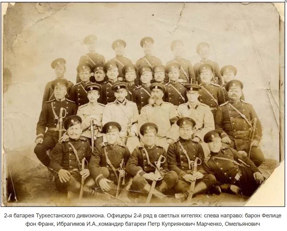 2-я батарея Туркестанского дивизиона. Офицеры 2-й ряд в светлых кителях: слева направо: барон Фелице фон Франк, Ибрагимов И.А.,командир батареи Петр Куприянович Марченко, Омельянович |