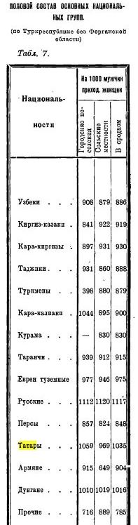 Из этой таблицы видно, что женщин больше чем мужчин только у русских, татар, кара-калпак и дунган.. Еще данные из этого справочника - ниже в Ташкент-1922.. |