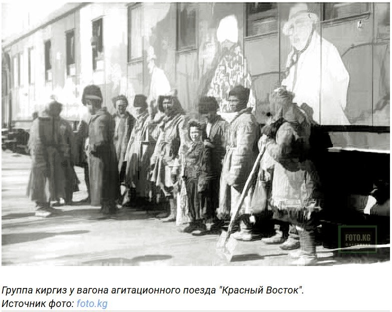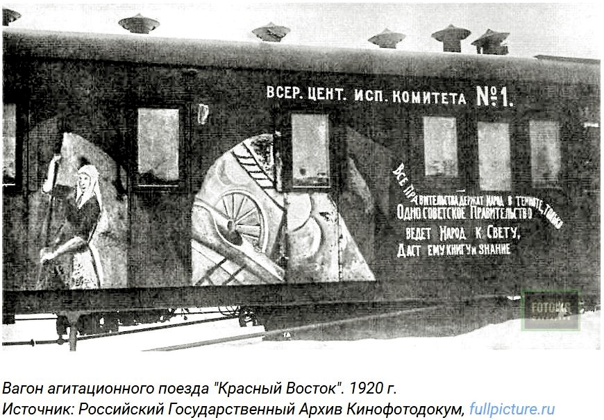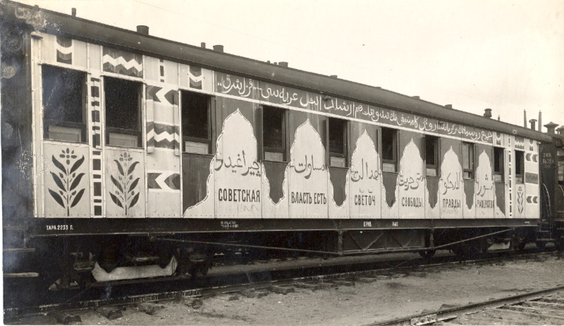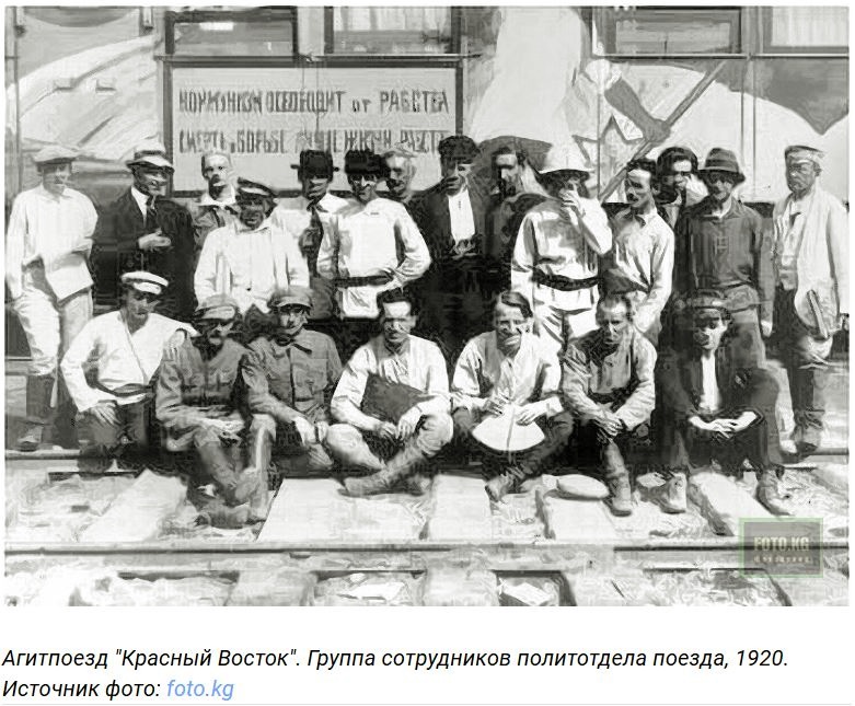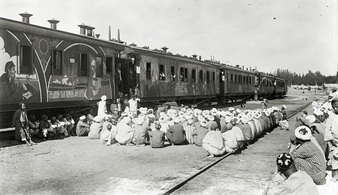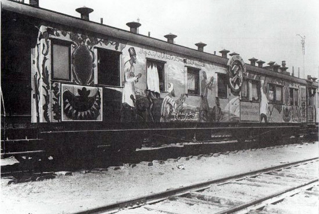 13 марта 1920 г. в Ташкент из Москвы прибыл первый агитационный поезд ВЦИК «Красный Восток». Он был полностью укомплектован пропагандистами и вез литературу на языках народов Туркестана. Агитпоезд возглавлял член ЦКК РКП(б) А. А. Сольц, комиссаром политотдела поезда был Г. Сафаров, один из руководителей политотдела 3-й армии Восточного фронта, а политруководителем — В. Г. Юдовский, заместитель председателя Высшей военной инспекции. |