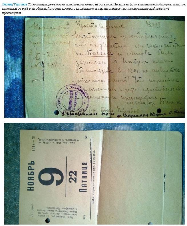 2.10.1920 по 1.09.1922 – учительница Ташкентского женского института просвещения. Удостоверение № 238 от 14.10.1920; № 320 от 25.07.1922. |