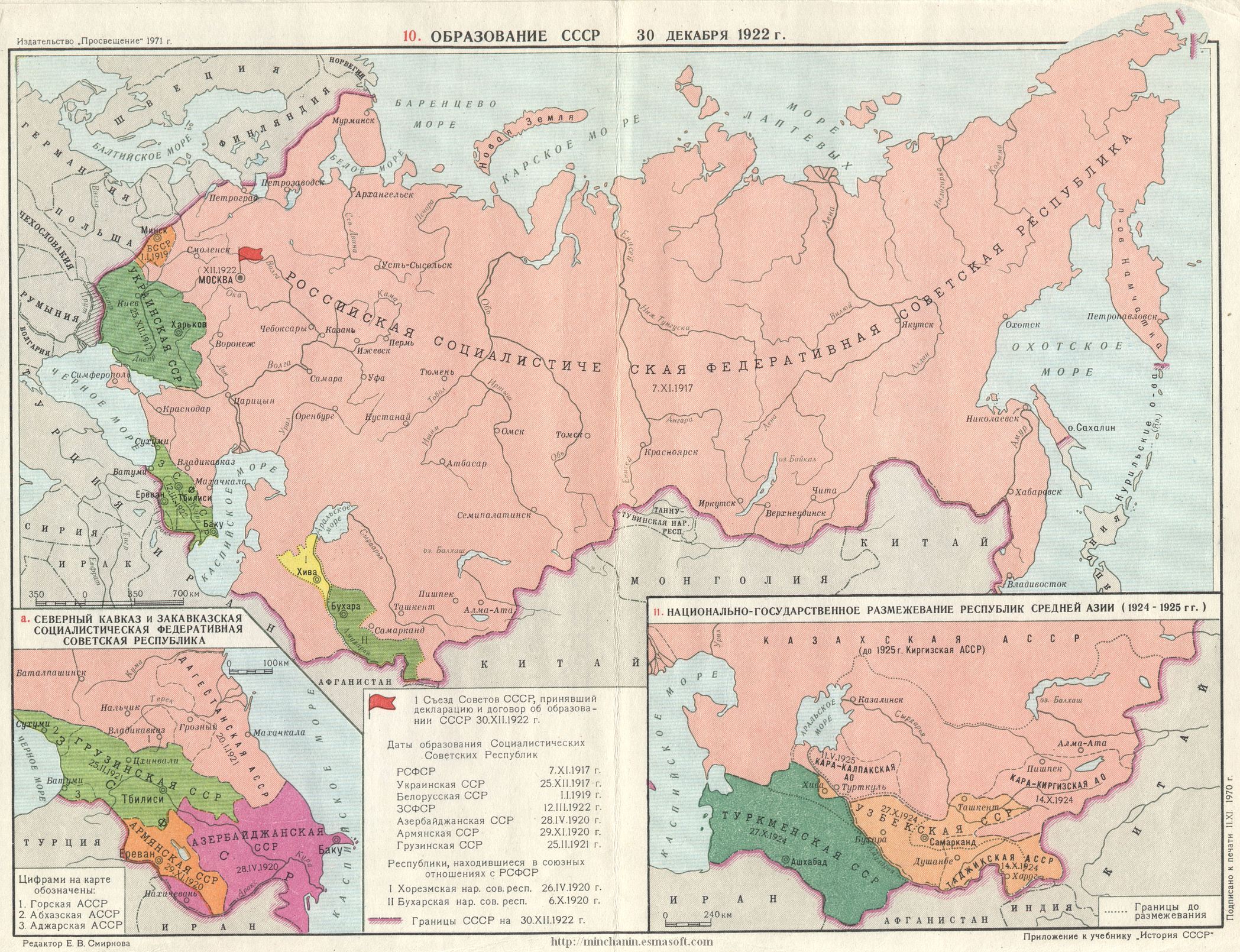 1922 MapSSSR 1917..24В 1922 был оформлен Союз Советских Социалистических Республик. Вместо РСФСР и автономных образований стали формироваться Советские Социалистические Республики с правом выхода из Союза. Этим поставили точку в спорах имперцев и националистов. Белое движение имперцев было разгромлено, как и «великорусский шовинизм» внутри Коммунистической партии. Народы гигантской территории Российской Империи стали определять свои границы (под управлением партии, естественно :) и занимались этим грамотные люди, из "бывших" элитариев, в основном.. У татар это были дети богачей и многочисленные "бывшие" студенты медресе Казани, Оренбурга, Уфы (этакий "талибан" :) |