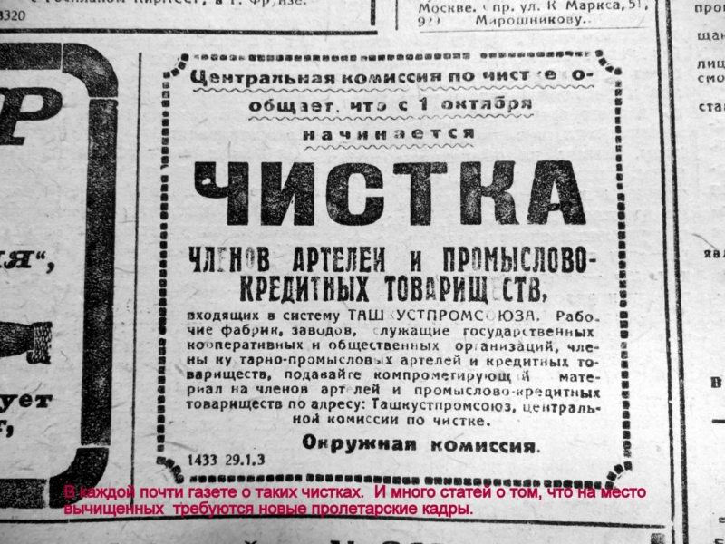 В 1929 году в Узбекистане арестовали 87 человек во главе с известным просветителем Мунавваром Кары Абдурашидхановым по делу организации «Миллий истиклол» («Национальная независимость»), 15 из них было расстреляно. |