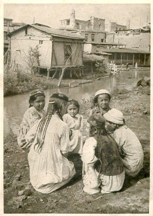 1930-s_Kukeldash_i_dev-na-beregu-Dzhara_Panov-GIZНа фотографиях комплекс Шейхантохур выглядит по разному из-за сноса главных ворот в 1930-х.. но левее должна быть видна Баланд-мечеть.. возможно, не попала в кадр. На фото слева скорее всего Кукельдаш (это Чорсу.. это точно Чорсу, в 1982 мы в этой «Яме» ели шашлыки с московскими друзьями.. но речка та же :) |