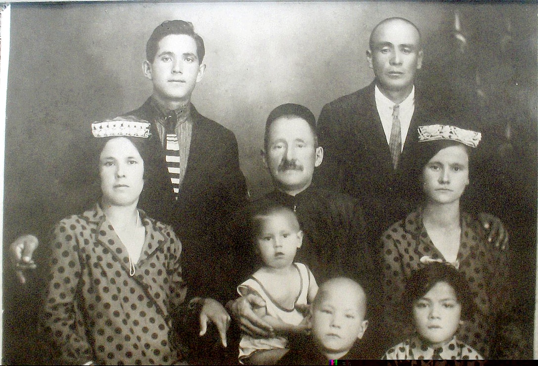1930-Марьям,Абдулла,Зариф,Сабира с мужем, Талгат,Анвар,ФатымаСлева: Марьям, рядом стоит ее брат АбдуллаВ центре: Зариф Исмаилович, на руках - Талгат 1927г.р. и внизу - Анвар 1924г.р. и Фатыма 1922г.р. Справа: сестра Зарифа - Собира с мужем Гарифом |