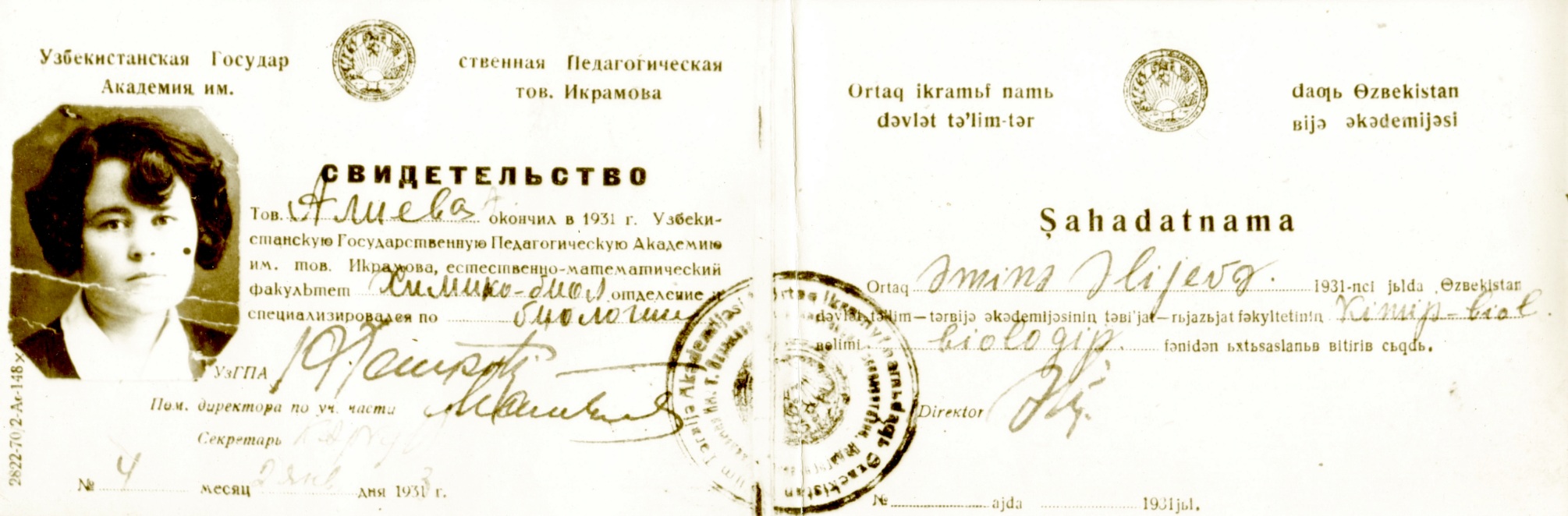 (рус и узб-лат) Узбекистанская Государственная Педагогическая Академия им. тов. Икрамова СВИДЕТЕЛЬСТВО Тов. Алиева А. окончил в 1931 г. Узбекистанскую Государственную Педагогическую Академию им. тов. Икрамова, естественно-математический факультет. Химико-биол. отделение и специализиализировался по биологии УзГПА (подпись) Пом. директора по уч.части (подпись) Секретарь (подпись) №_4_ месяц 2января дня 1931 3 г. |