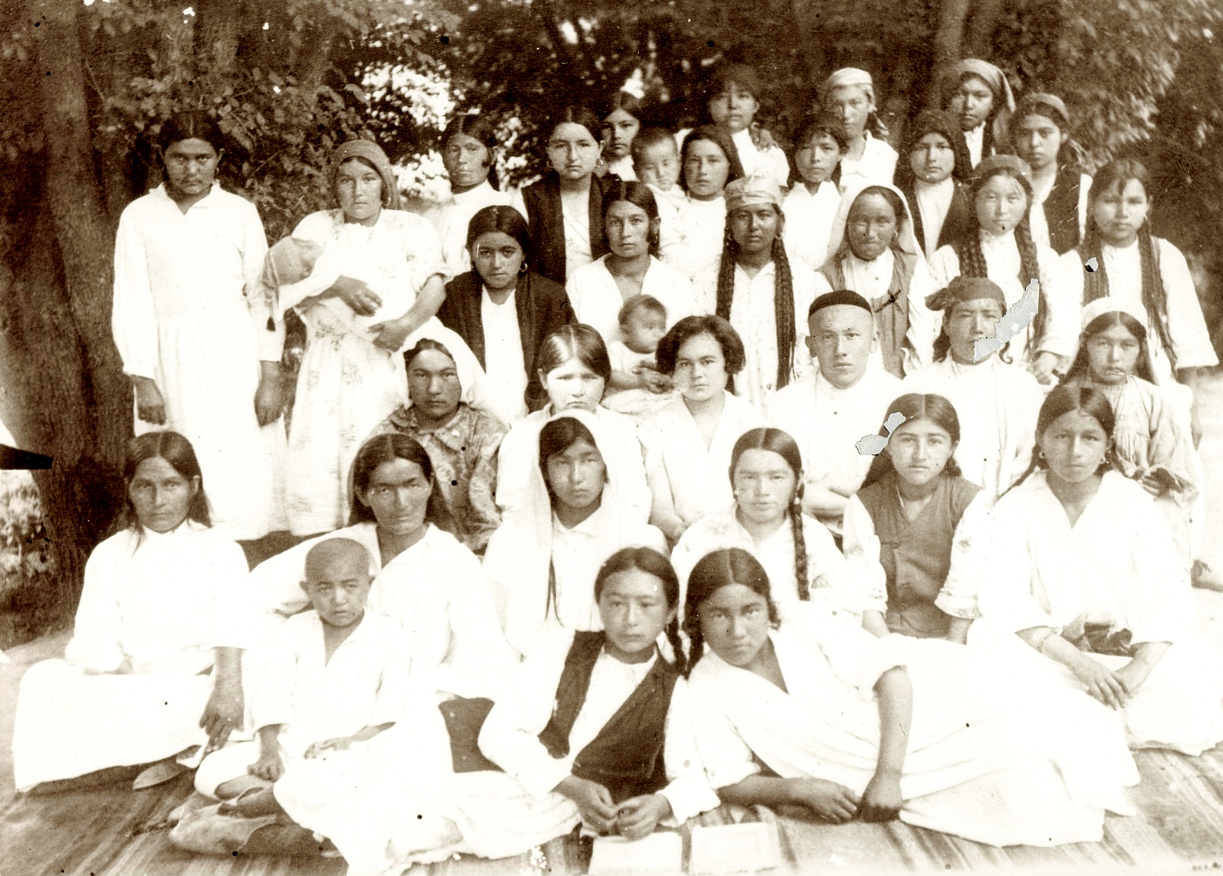 1 ряд: Шумакова Ирина, Космачевская Ирина, Терехова Татьяна, Ряювская(?) Галина, Шалдыбина Наталья, Назарова Зоя, Шмуйлович Лека, Равинский Олег, Рублевская Аина Второй ряд, в том же порядке: Комальдинова Д…., Шалдыбина Людмила, Гр. П. Вынежнев, преподаватель пения, Е.В. Аносова, преподаватель рус. яз., К.Н. Углицкий преп-ль химии и ботаники, Фридман Любовь, Гольщинская Мария |