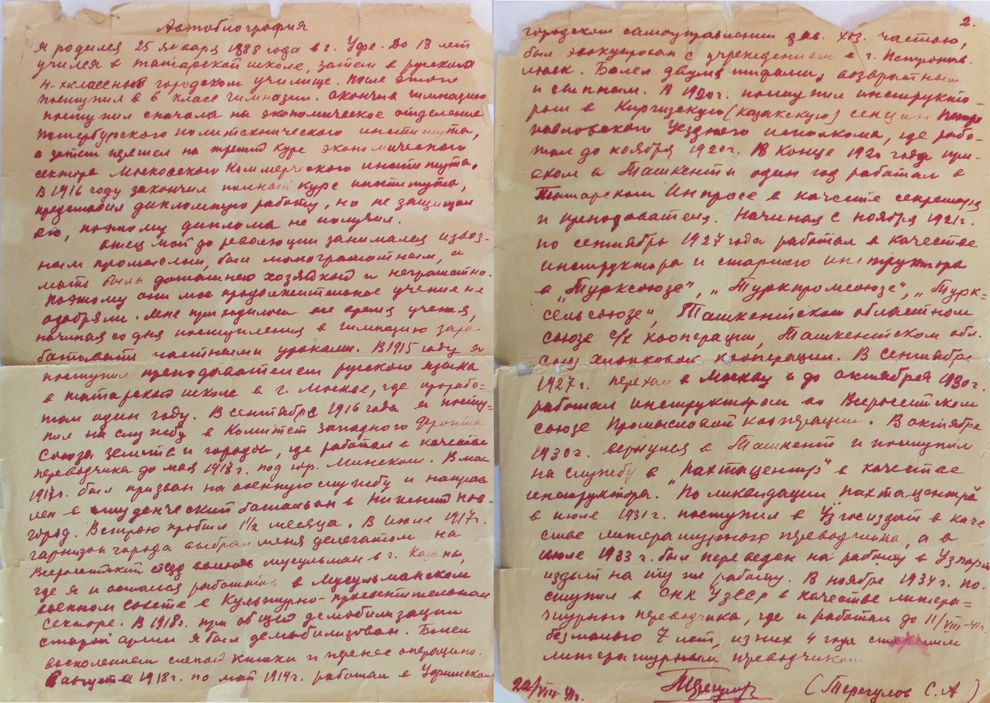 Ташкент 1941 августС. А. Терегулов 53 года.. работал старшим литературным переводчиком в СНХ УзССР из Автобиографии 1941г |