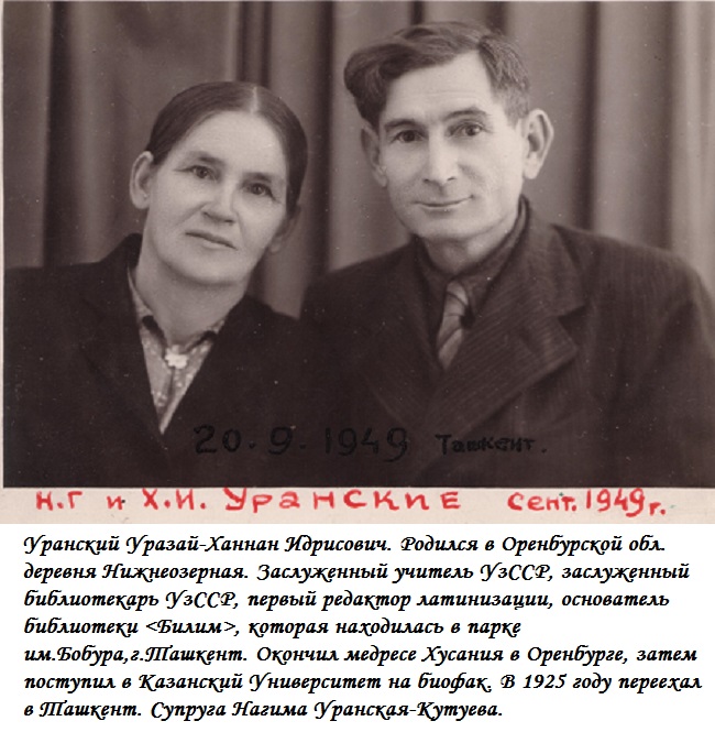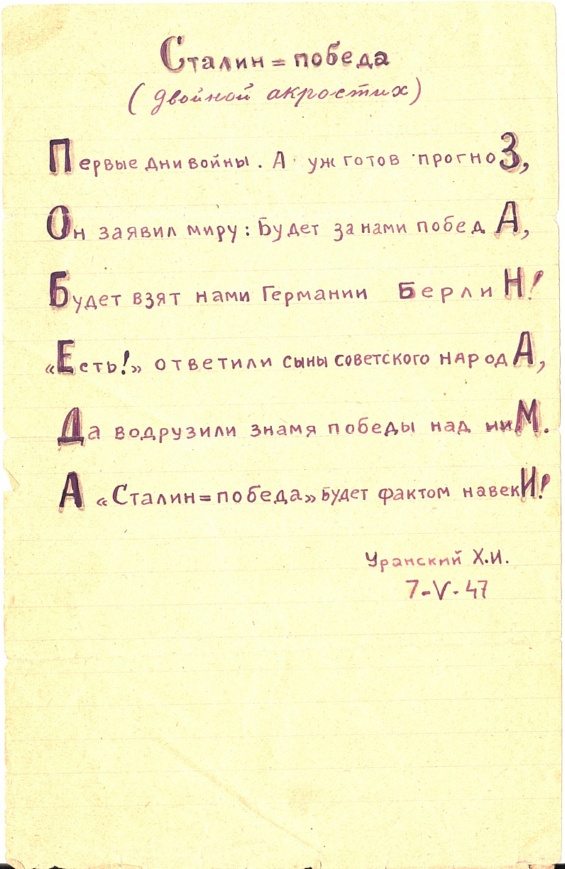 1947-05-07 стихи Уранского_Х_IСталин=победа(двойной акростих) Перые дни войны. А уж готов прогноЗ, Он заявил миру: Будет за нами победА, Будет взят нами Германии БерлиН! "Есть!" ответили сыны советского народА, Да водрузили знамя победы над ниМ. А "Сталин-победа" будет фактом навекИ! 1949-09_Uranskie_Hannan_i_NagimaСупруга - Нагима Кутуева |