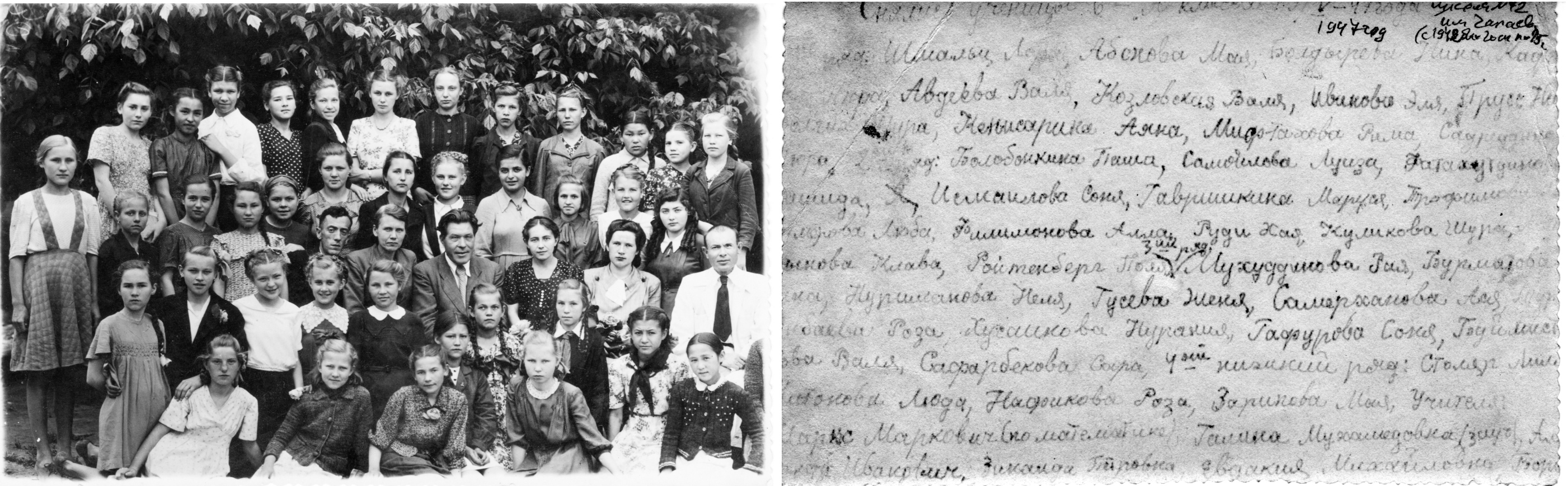 надпись на обороте:Cнялись ученицы 6 "А" класса ... V-47 года[поздняя надпись Сании:] школа №42 им Чапаева 1947 год (с 1942 был госпиталь по 45) 1 ряд: Шмальц Лера, Абонова Мая, Болдырева Нина, Када.. ..Люда, Авдеева Валя, Козловская Валя, Иванова Эля, Прусь Н.. .. Шура, Кенисарина Аяна, Мифтахова Рима, Садреддинова |