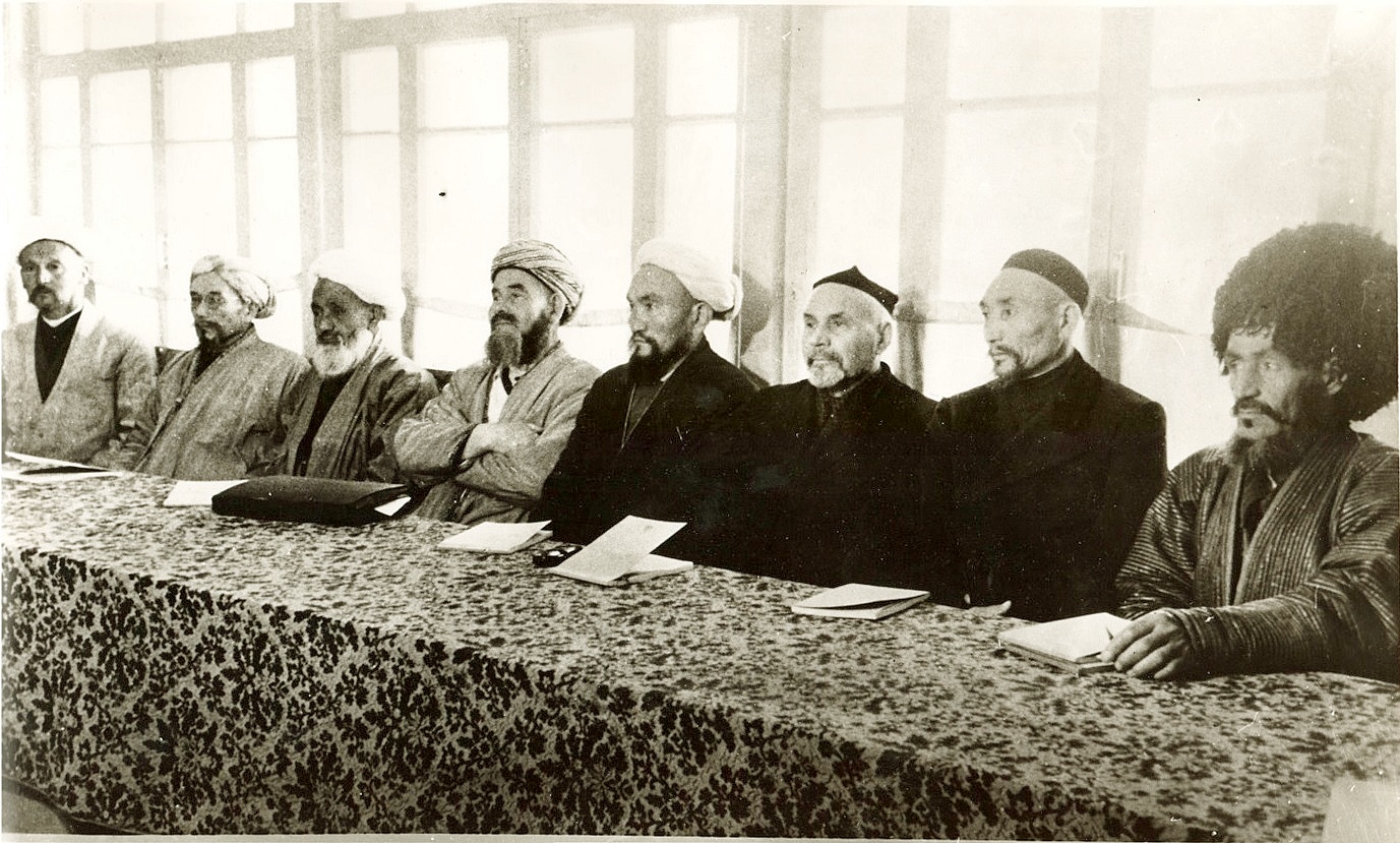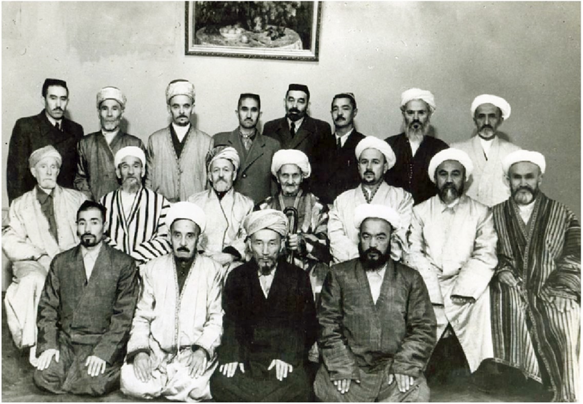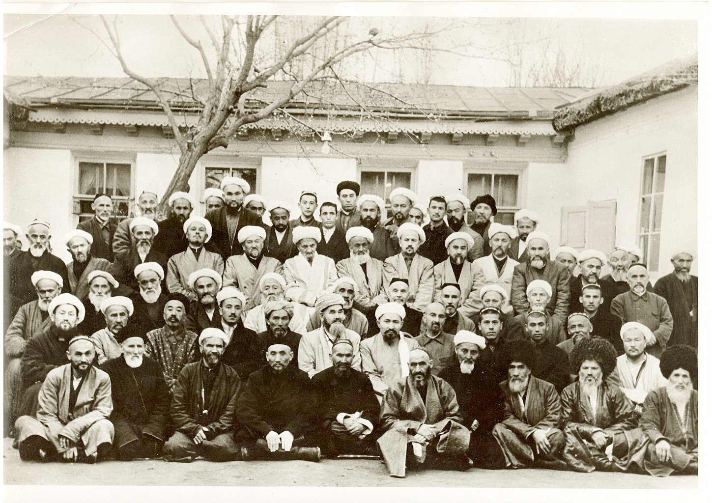 1949 Ташкент 4-курултай САДУМ.Муфтий Духовного управления мусульман Средней Азии и Казахстана Эшон Бабаханов (средний ряд 4-слева) и муфтий ДУМЕС Шакир Шайхислам улы Хиялетдинов (средний ряд 3-слева)... справа-внизу сидит, похоже, товарищ из Оша с фото 1947 с АбдульВадудом.. |