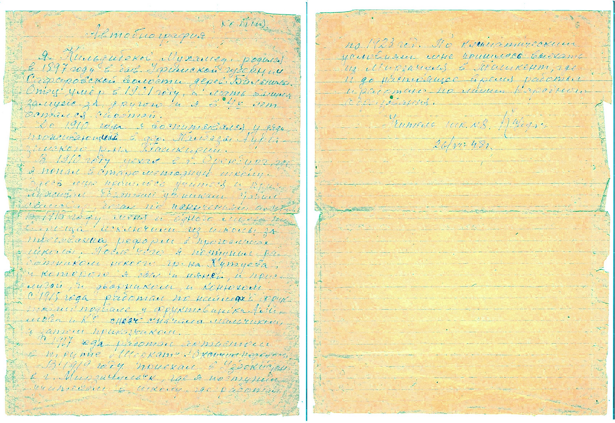 1948-06-26 Avtobiogr-KildibekovaАвтобиография (копия)Я, Кильдибеков Мухамед, родился в 1897 году в быв. Уфимской губернии Сафаровской волости дерев.Балыклы. Отец умер в 1901 году, а мать вышла замуж за другого и я с 4-х лет остался сиротой. До 1910 года я воспитывался у дяди проживавшем в дер. Толбазы Аургазинского р-на Башкирии. |