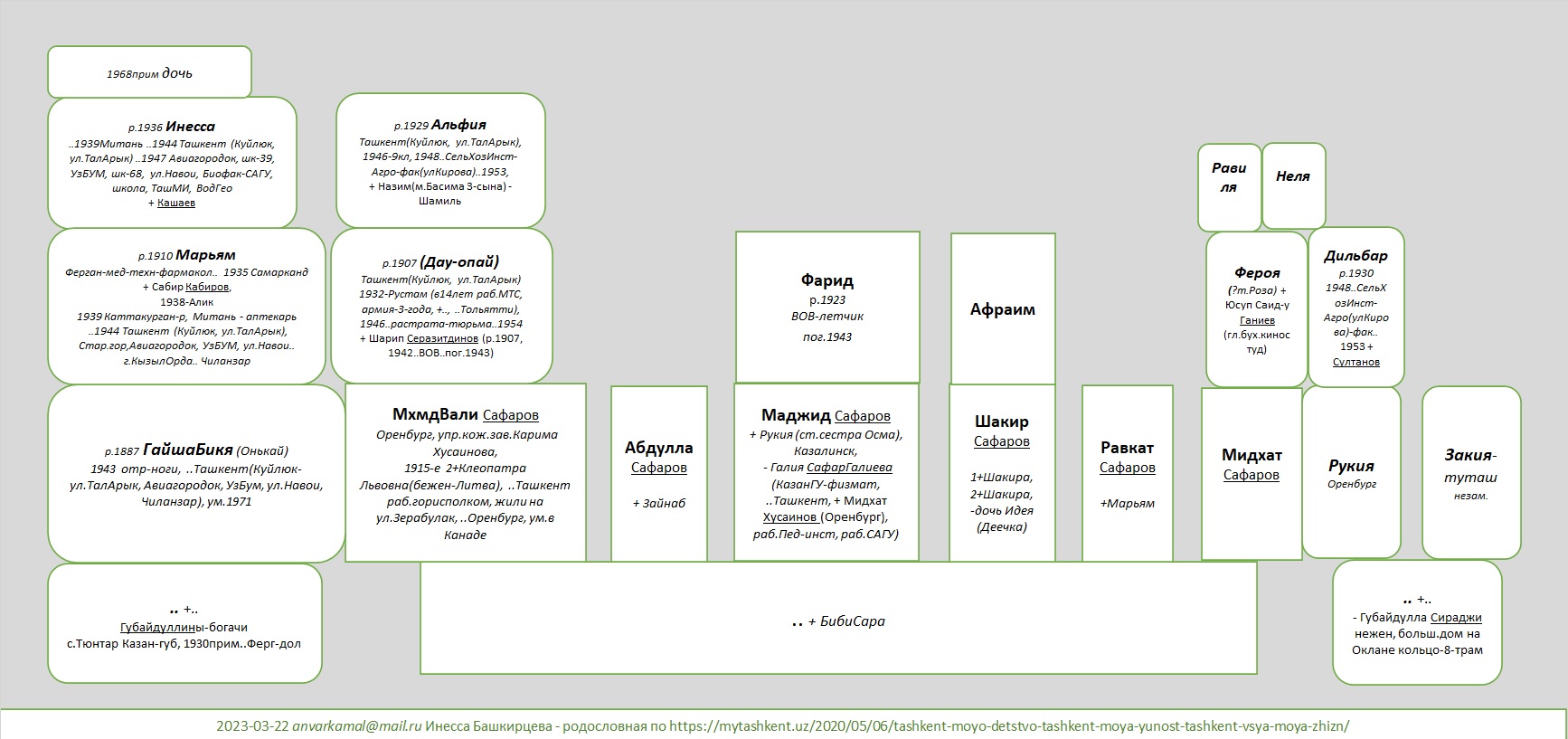 Стол накрыли белой скатертью, мама испекла, на вазах фрукты и конфеты. Я посидела со всеми, покушала, и мы с Аликом ушли на улицу.Я пошла к Свете Лагуткиной, с которой мы в то время близко сдружились и могли с ней хоть где уединиться и подолгу поговорить о том, как бы мы хотели жить, совсем по-другому, и наши желания очень совпадали. Мы с ней часто сидели в нашем подъезде, как и в этот раз, так как у нас гости, и меня могут позвать. Так вот, сидим мы со Светой в подъезде на первом этаже, и вдруг жених вышел в подъезд покурить. Он был в форме, весёлый такой, что-то нам сказал, мы тоже развеселились. В молодости развеселиться, вообще, ничего не стоит. Мы обнаглели и сказали ему: «Вы — лейтенант?» Засмеялись, испугались и убежали на верх по деревянной лестнице на второй этаж. Там был парткабинет, который почти всегда был закрыт. Фамилия секретаря партийного комитета лётного состава была Безруков. Запоминающаяся фамилия. | После свадьбы Альфия-опая и Назым-абы наши взрослые вспоминали свои нелёгкие женские судьбы. Дау-опай и мама остались вдовами совсем молодыми. А Онькай хоть и не была вдовой, но её муж — мой дедушка Вали-абы — Мухаммад-Вали Сафаров — был жив-здоров, но .. [* далее рассказ о нем в Оренбурге, Ташкент в революцию] |