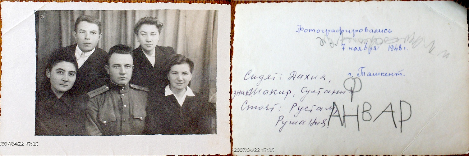 Бабушка Шамсенур (44 года) с моим папой — Рустамом 16 лет и 10-летней дочкой Зумарой переехали в Ташкент. Здесь им помог Гаряй-абы — старший брат Шамсенур. К сожалению подробностей я не выяснял, знаю только что Гаряй-абы помог выправить документы (папа стал Камальдиновым, хотя Зумара на фото подписывалась Камаловой). Папа устроился в лакокрасочный цех и катал по двору бочки чтобы смешивать лаки. |