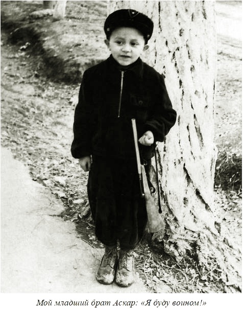 -Мой младший брат Аскар: «Я буду воином!»Когда Аскар был маленький, на вопрос, что он любит кушать, отвечал: «Суп, картошка и чай с сахаром». Лет в пять он носил палку, утверждая, что это ружье, и что, когда он вырастет, станет воином. |