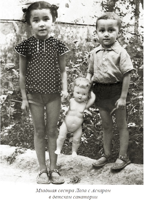 -Младшая сестра Лола с Аскаром в детском санаторииЛето мы проводили в детских санаториях, в основном в «15 лет Узбекистана» на Кукче. Путевками нас обеспечивала тетя Мура, за это мама обслуживала их семью, обстирывала, доставала дефицитные в те годы сахар, муку и прочее.В санатории Лола часто ездила вместе с Аскаром и на правах старшей опекала его, подбирала ему самую лучшую одежду (в санатории нельзя было носить свою одежду). * АК: об этом санатории есть в воспоминаниях моей мамы за 1940 |