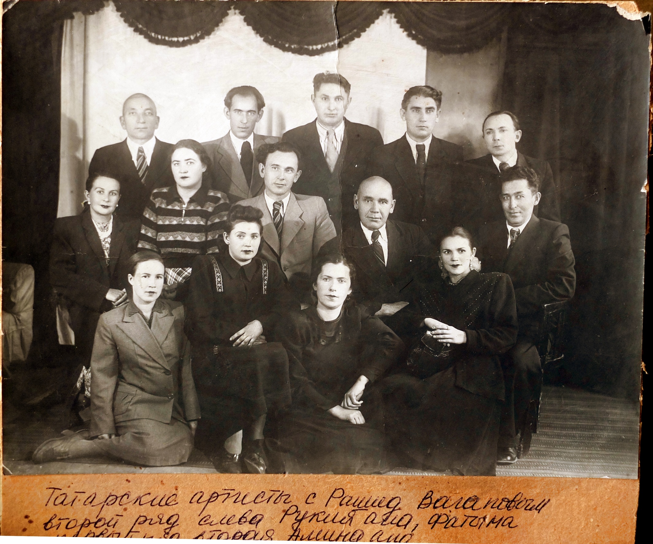 1952_Tashkent_ans-Vagapova_ i_Fatyma-IbragimovaСлева-стоят (5муж): ?, ?-Файза Матросов, ?, ?, ?-Азаль Ягудин. Сидят (2жен,3муж): 1 — Ркия Бахтеева (певица, дочь Исмаила Бахтеева-1), 3-ряд (4жен): 1 — ?, |
