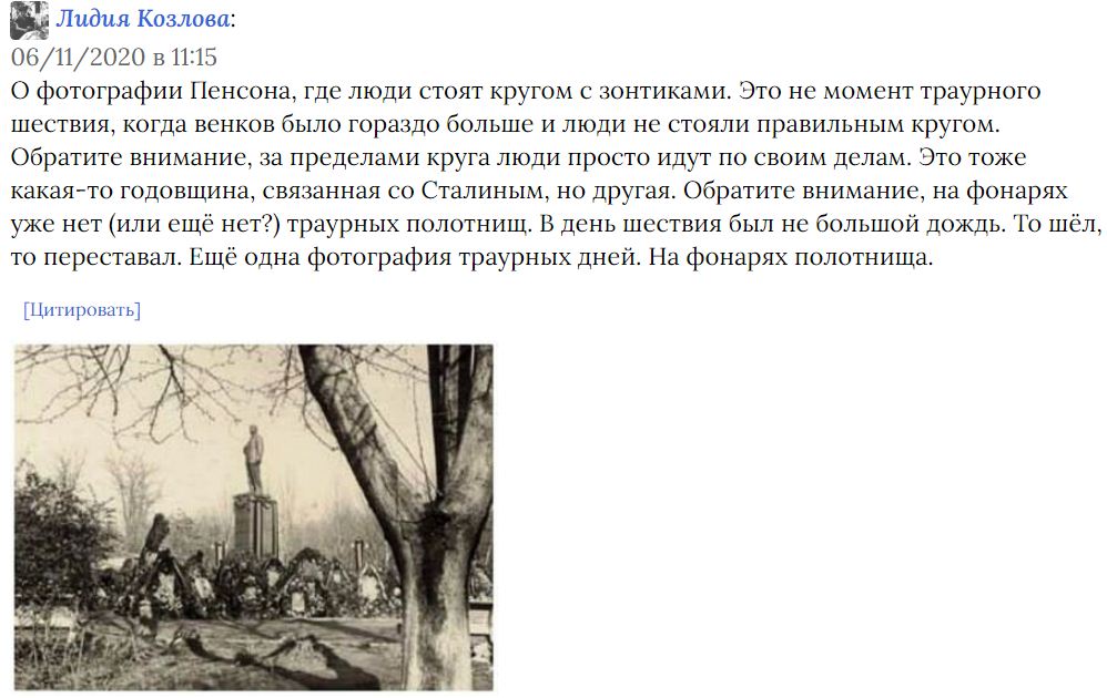 Больше я в садик не ходила ….Вечером , когда пришла мама с работы .. ..мы как все отправились в Сквер.. Бабушка и мама в чёрном ..когда подошли к Скверу.. там уже некуда было встать .. народ мялся около этого самого Пятака .. и вот от этого Пятака до памятника яблоку негде было упасть ( какие там цветы, которые мы сажали , все было завалено чем то и вытоптано )..Если кто падал в обморок ..как это случилось с какой то женщиной ..то тело несли на руках поверх голов ..Горе было искреннее и глубокое .. |