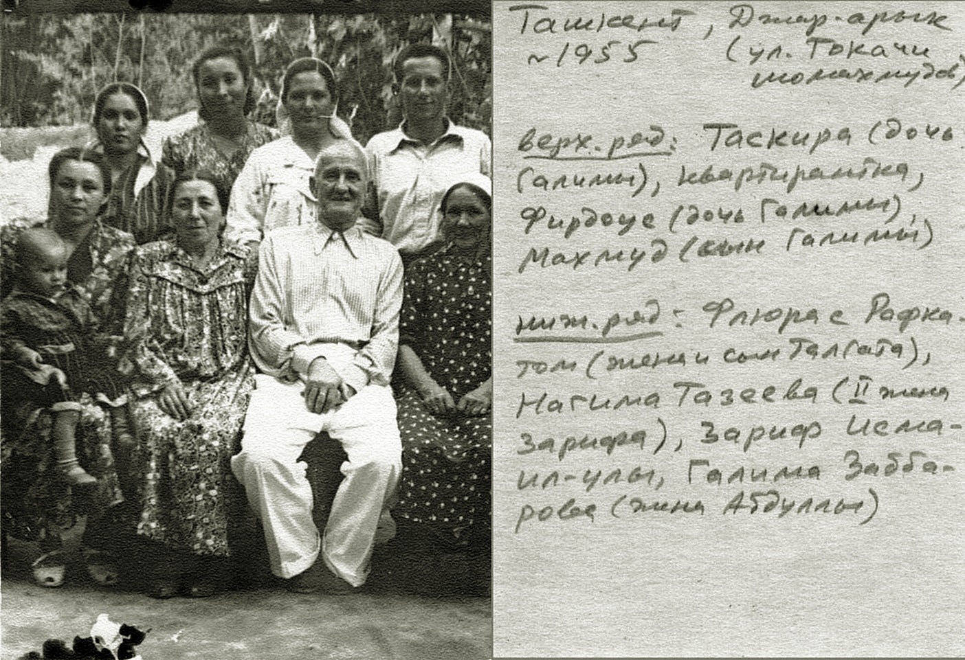 1955~Tashkent-Dzhar-aryk_Zabbarovy_i_Ismailovy-15арх-Сании-Исмаиловой;Стоят-слева: Дети Галимы и Абдуллы - Таскира, квартирантка, Фирдоус, Махмуд Сидят-слева: Флюра с Рафкатом Махмудовы-15, Нагима и Зариф-бабай Исмаилов-15 67 лет, Галима. |