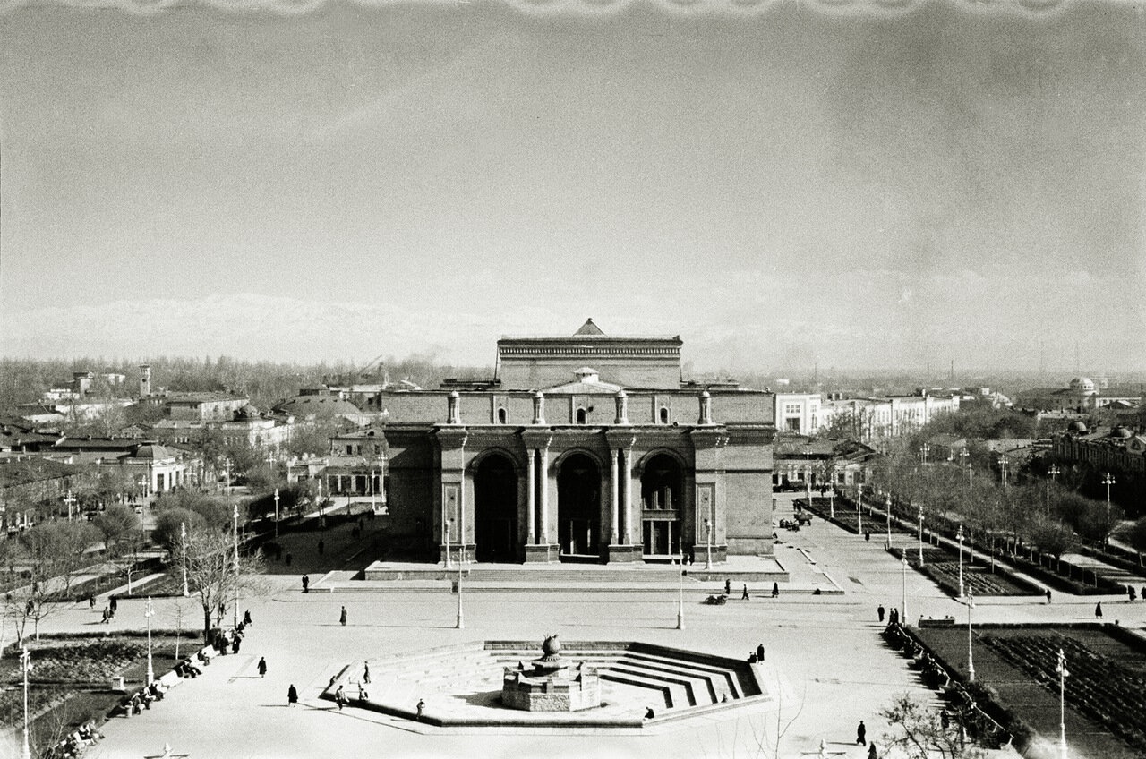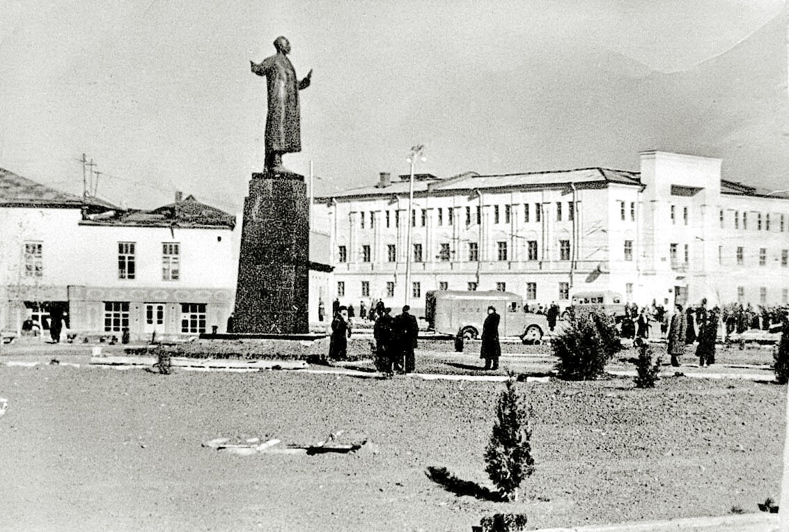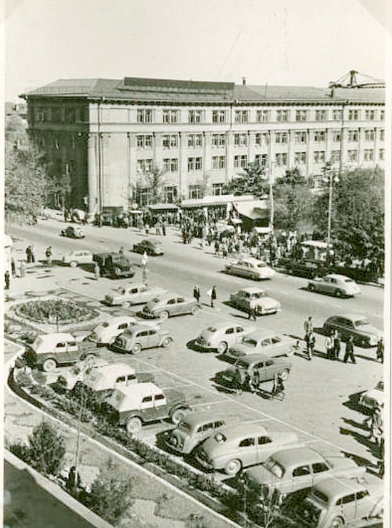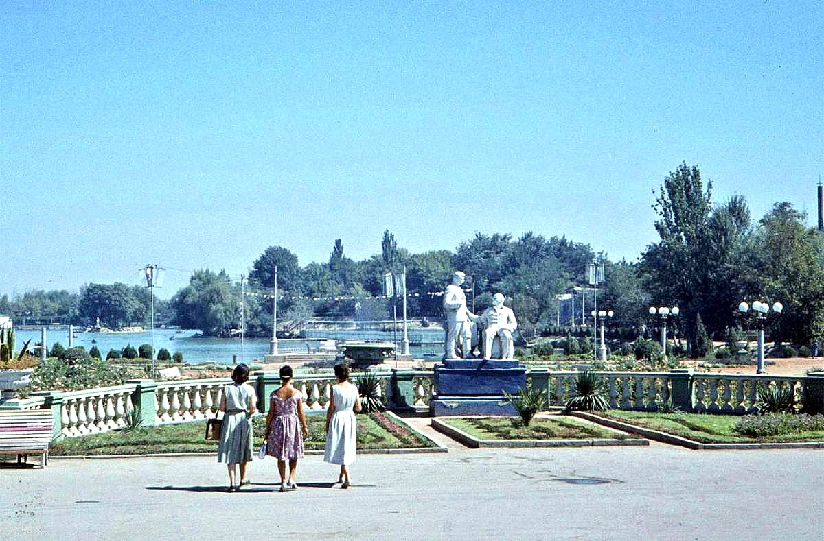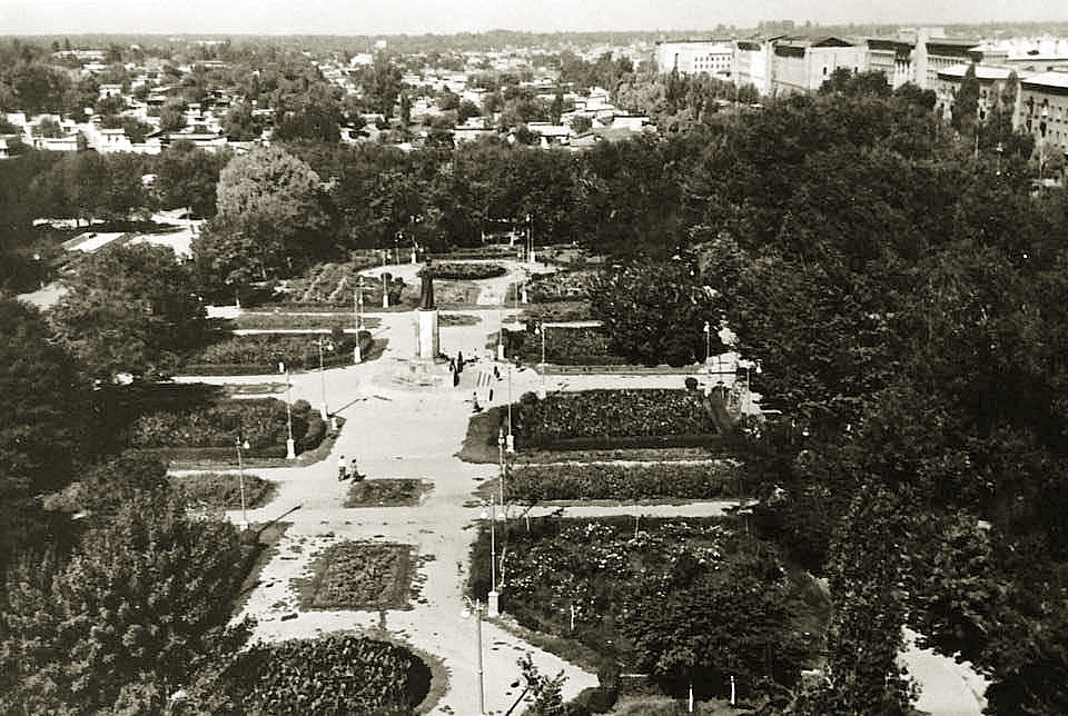 Улица Богдана Хмельницкого. Справа обувная фабрика и клуб обувщиков, средняя школа 90, где я преподавала русский язык и литературу. Слева — жилые дома, фабрики и филиал Университета дружбы народов имени Патриса Лумумбы. Остановка у Государственного педагогического института имени Низами. В боковых зданиях размещались общежития института. Весь ансамбль институтских зданий полукольцом охватывал площадь, в центре которой был воздвигнут памятник М.В. Фрунзе. Площадь была названа его именем. |