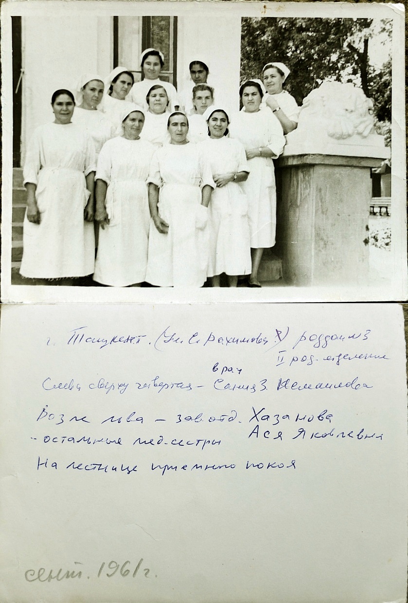 опубл:2020-11-30После 3-годичной отработки в Сырдарьинской области моя мама устроилась на работу в 3-роддом на Тахтапуле. Сохранилось одно фото с этой работы. Вот что она рассказывает: Воспоминания Сании Зарифовны 2023-11-20 стр.9-10 |