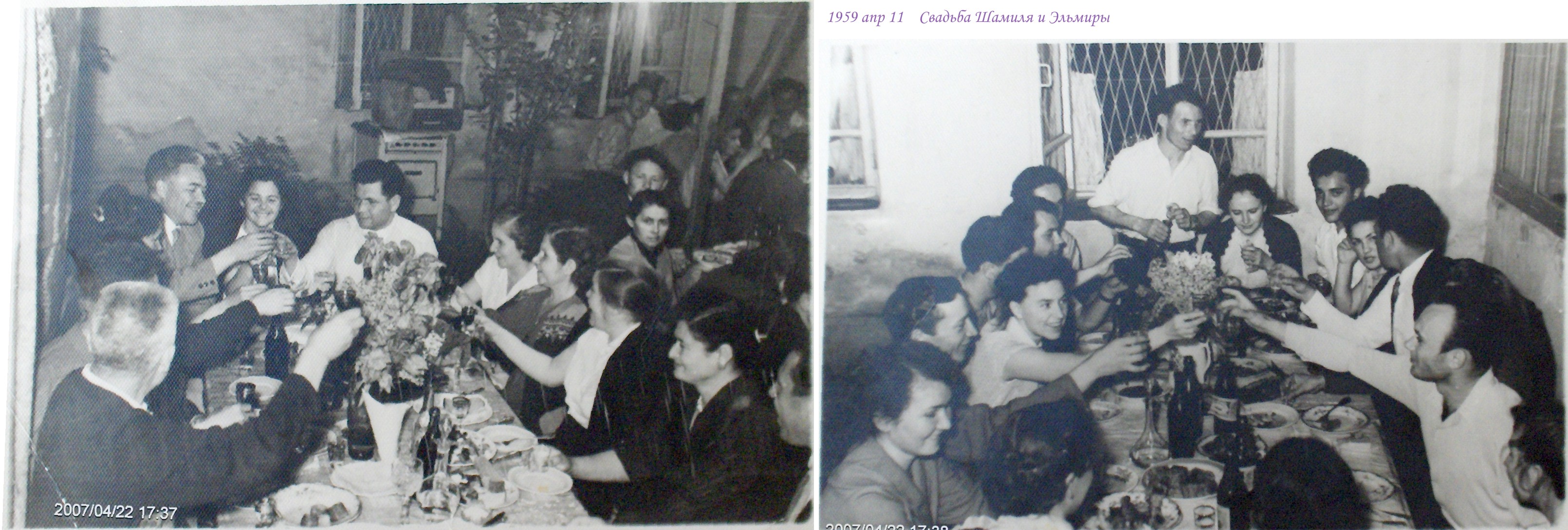 1959apr11_svad'ba-ShamiliaНа фото справа: мой папа стоит с бутылкой, а его сестренка Зумара чокается с лысым :)Зумара (22 года) в 1959 году ездила в Ульяновск, есть фото с родственниками |