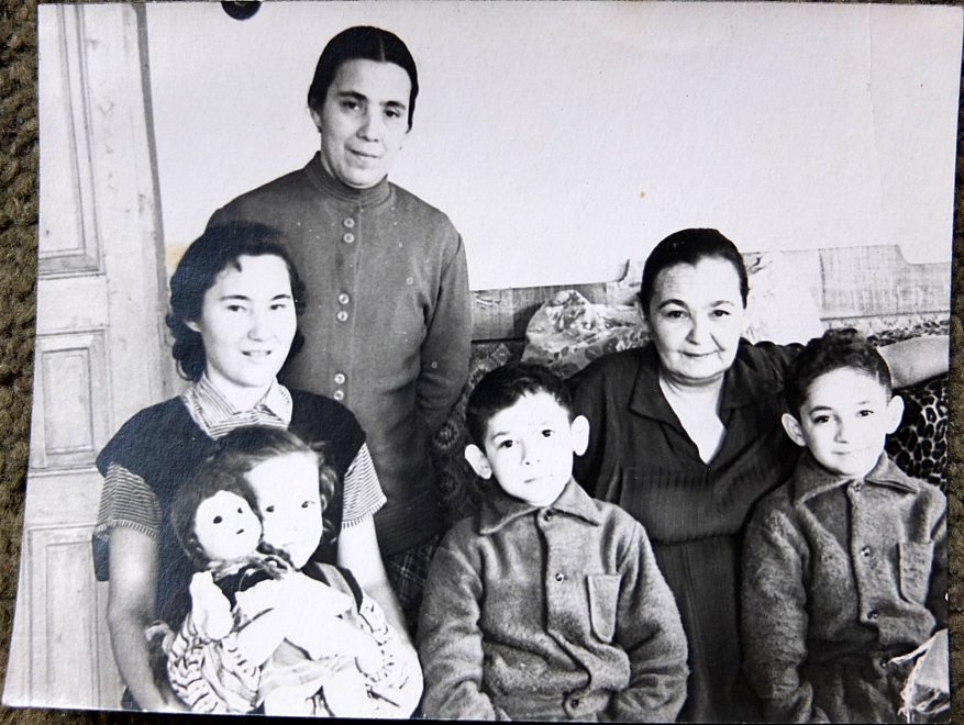 1960-02_Sania,Fatyma,Sagadat_arh-T-MahmudovaНадпись на обороте (Сании Исмаиловой):февр. 1960г На Паровозной, в доме Талгата Фатыма-опа, Сания с Райхан, Гарик и Яник — внуки Сагадат опа старший слева |