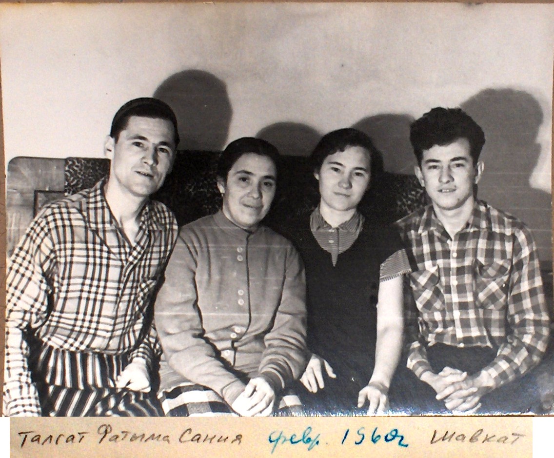 1960-02_Talgat,Fatyma,Sania,ShavkatТалгат 33 года, Фатыма 38 лет, Сания 26 лет, Шавкат 23 года .. Мама после окончания института в 1957 работала в Сырдарье..Воспоминания Сании Зарифовны стр.17