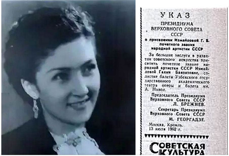 Творчество мастера образного движения Галии Измайловой было высоко оценено общественностью - ей в 1962 было присвоено звание народной артистки СССР, она также была удостоена государственных премий Узбекистана имени Хамзы и СССР, два раза орденом Ленина и другими государственными наградами. | Если Вы окажетесь в Ташкенте, не забудьте посетить Узбекский Государственный Академический Театр им.А.Навои. Главный балетмейстер театра Галия Баязитовна Измайлова несомненно вложила в спектакль свой неустанный труд. |