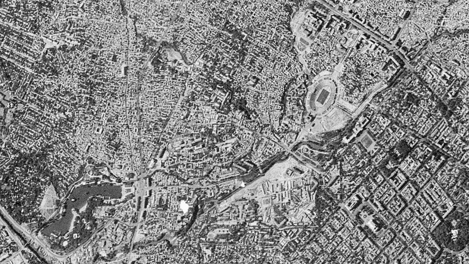 1963_Tashkent_BeshAgach-Almazar_sputn-fotoНа спутниковом снимке 1963 года мы видим внизу-слева Комсомольское озеро с площадью БешАгач. От него наверх идет улица изгибаясь на право — это проезд Фурката. От него вправо до стадиона Пахтакор район улиц Алмазар и Укчи.. |