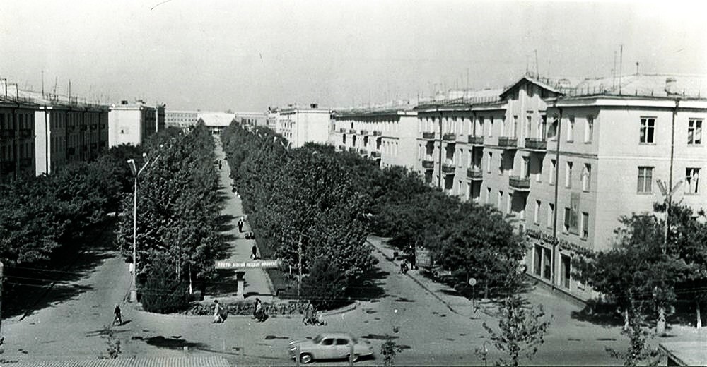 1964 Ташкент ул Гагарина и ПионерскаяНа фото слева: внизу — улица Пионерская.От нее отходит бульвар Гагарина и в левом доме (1 или 2, не помню) магазин с выпуклыми витринами. |