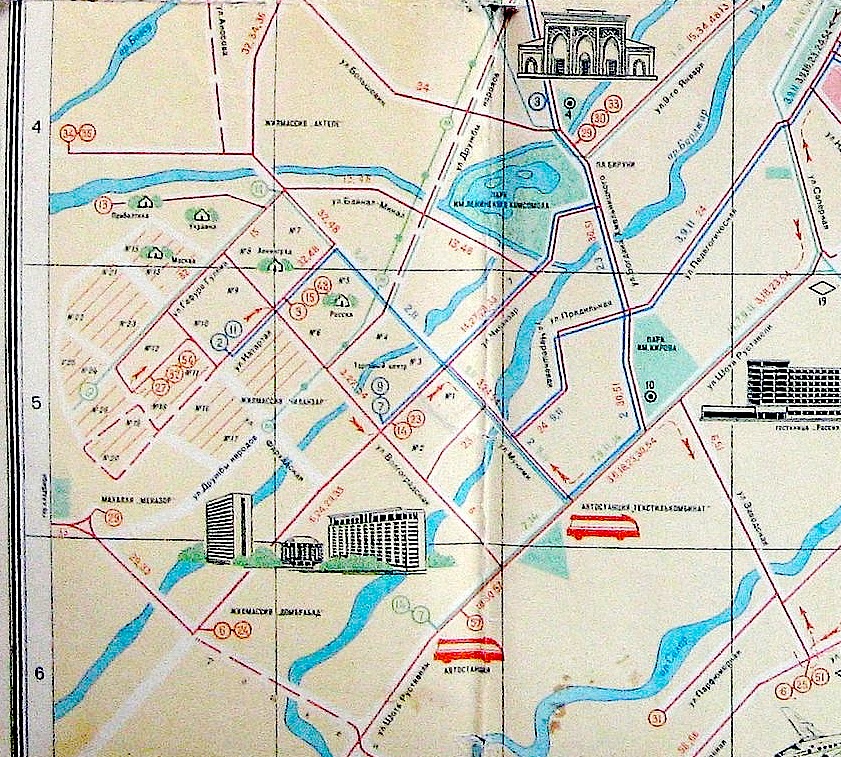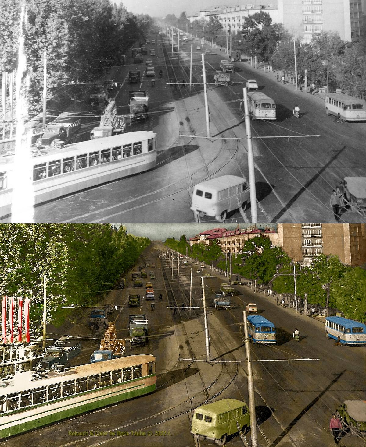 1966_Chilanzar_transport-shemaНа схеме 1966 года полно транспорта до строящегося после землятресения нового Чиланзара.. На следующем фото трамвай поворачивает с ШотаРуставели на Мукими (остановка «Текстиль»). Это 11-трамвай (тип КТМ), он шел до Ак-тепе. А дальше шла «девятка» (тип РВЗ). Бывало мы пересаживались на Ак-тепе. Трамвай стоил 3 копейки и на пересадках не экономили. 1965-68_Mukimi-Sh_Rustaveli_col-BobSergeev |