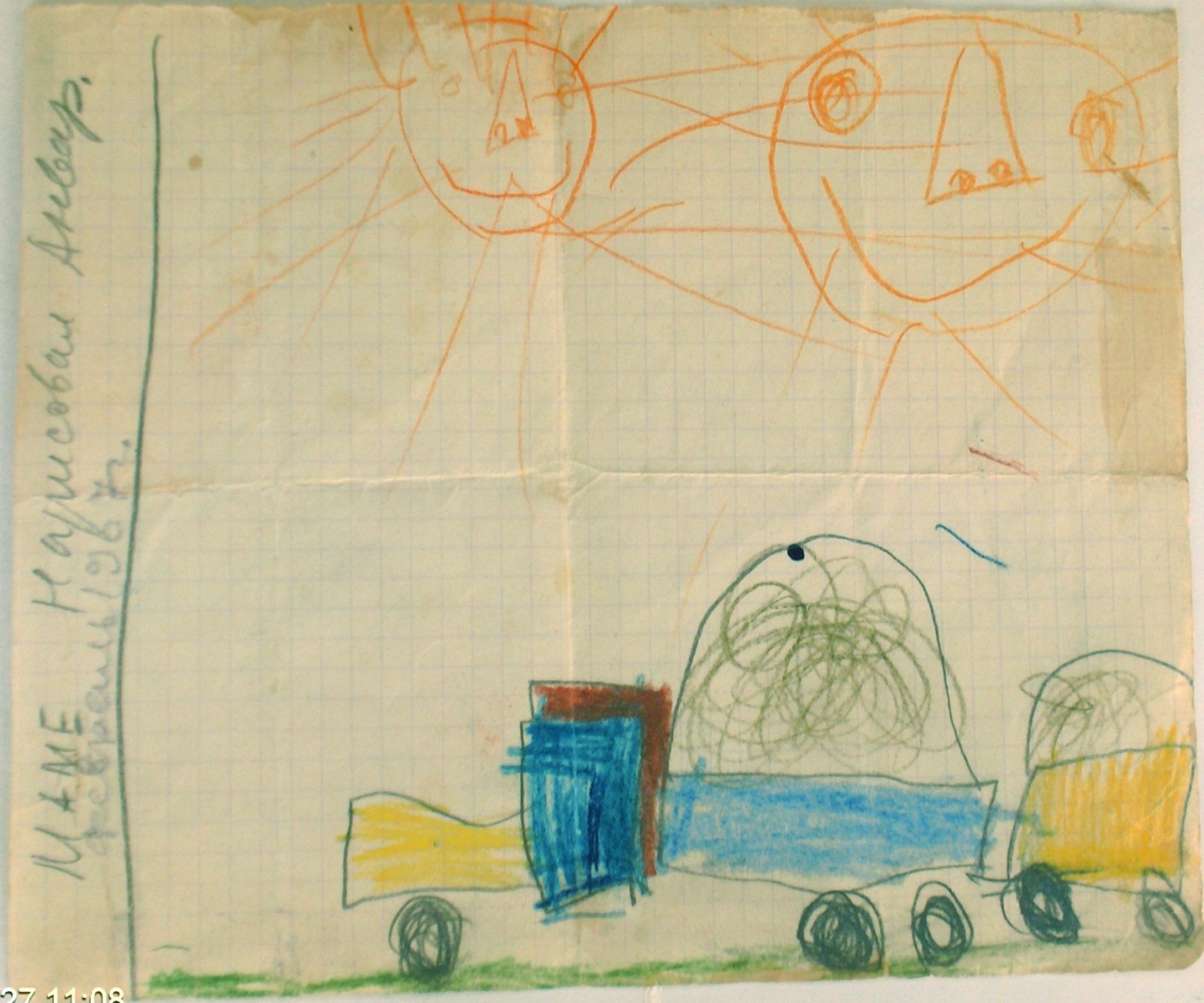 1967-02_Chilanzar_Anv-to-mamaКого-то может удивить на рисунке два солнца.. но это легко объясняется психоанализом. Для ребенка яркое теплое солнце бессознательно ассоциируется с мамой, а в данном случае был еще и папа. Вроде-бы большее солнце похоже на папу. Ну и груженный грузовик тоже не один, а с прицепом.. Тут могут быть варианты, но все-таки грузовик — это внешний объект.. для мальчика из махалли скопление народа во дворе (там была веранда-столовая), строительная суета (рядом, справа по диагонали, строили дом №6) было открытием нового мира и в этом плане «солнышки» смотрят с радостью со своего балкона на 3-м этаже.. думаю — большее солнышко это папа (он сделал мне экскаватор и кран), а малое — я сам.. а мама? ей я подарил этот рисунок! |